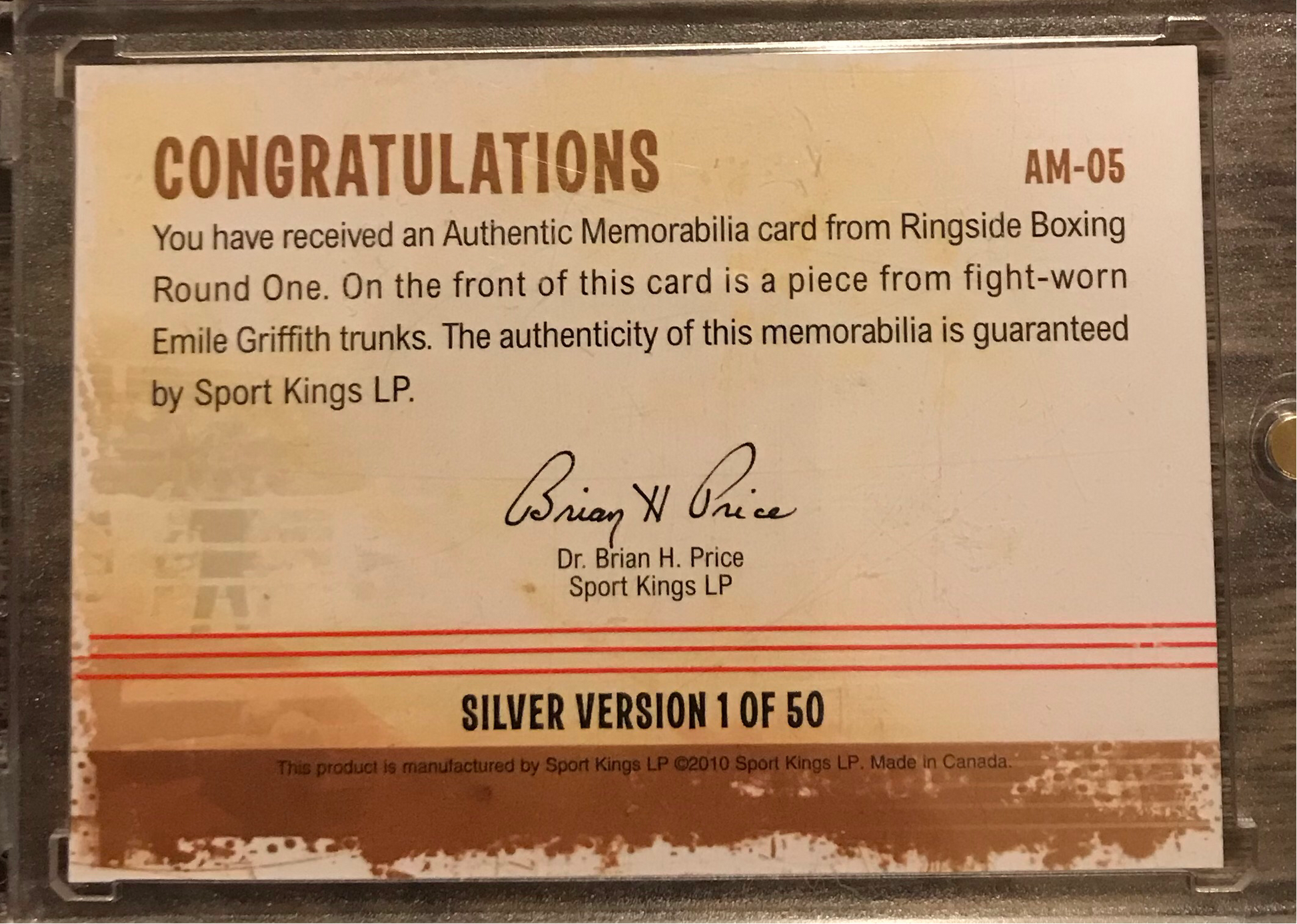 2010 Ringside Boxing Round 1 Emile Griffith Authentic Memorabilia AM-05 Fight worn trunks silver version 1 of 50
