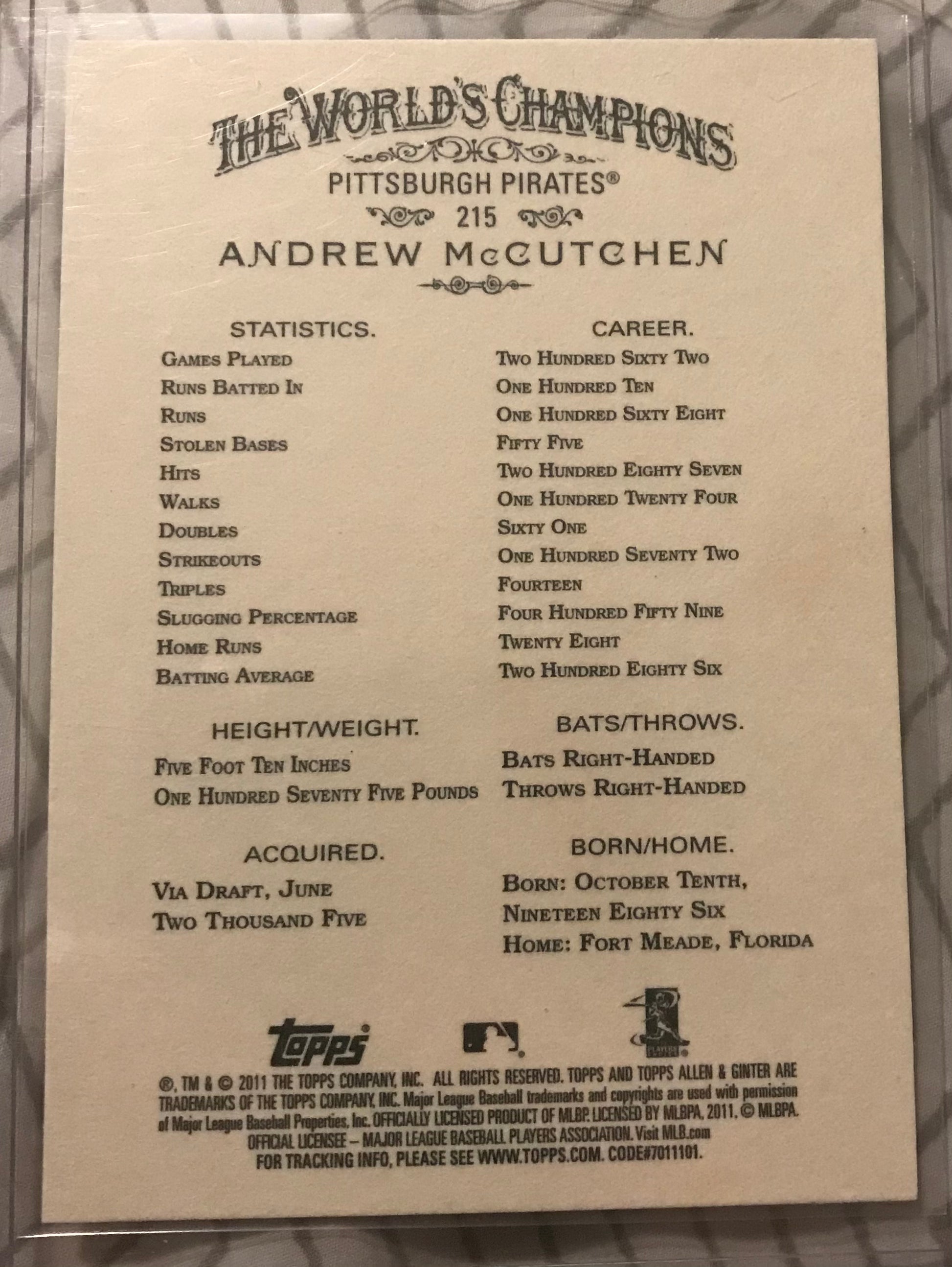 2011 Topps Allen & Ginter Andrew McCutchen code parallel #215