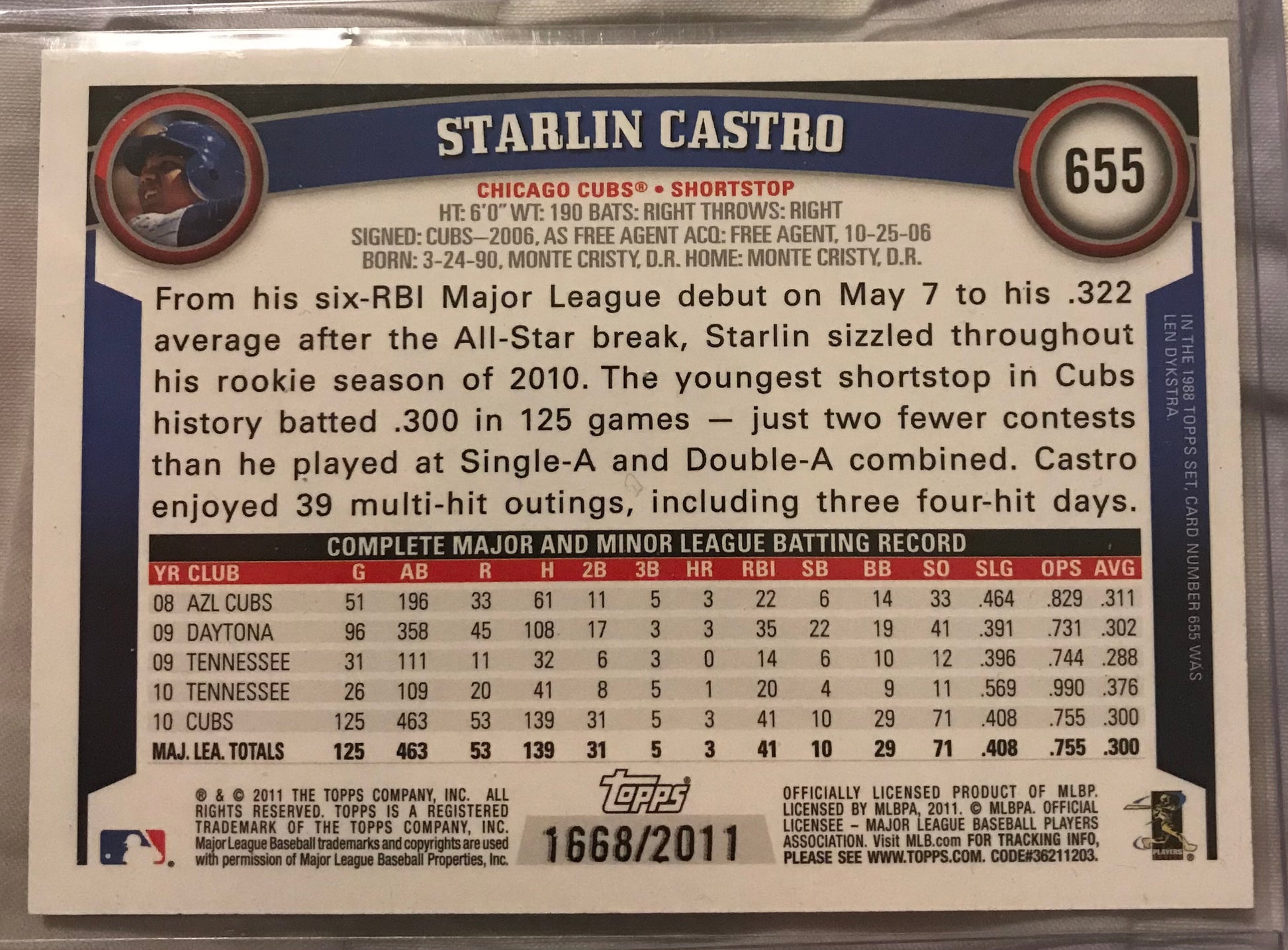 2011 Topps Update gold parallel Starlin Castro #655 1668/2011