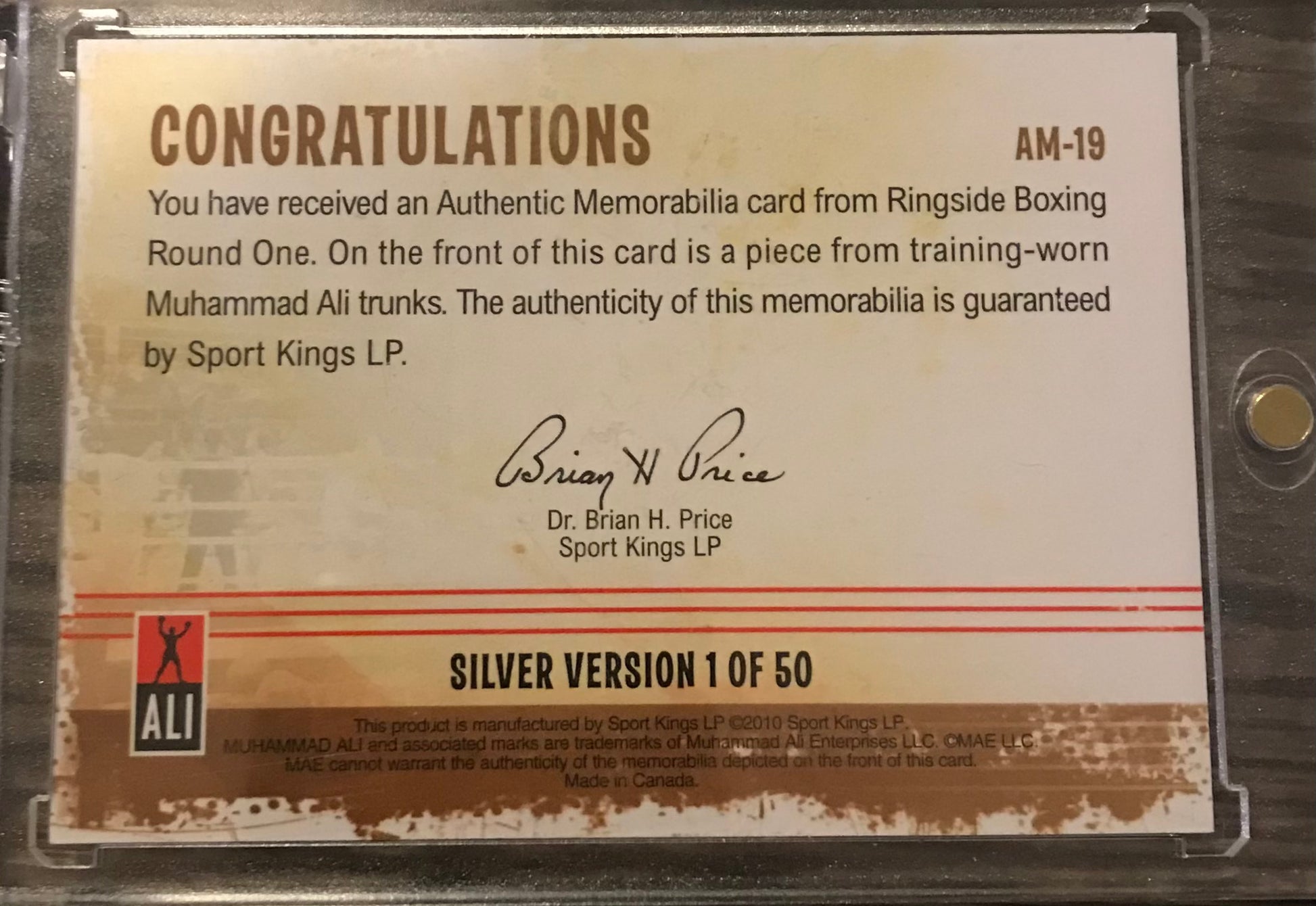 Ringside Boxing Round 1 Silver /50- Muhammad Ali Training worn trunks memorabilia AM-19