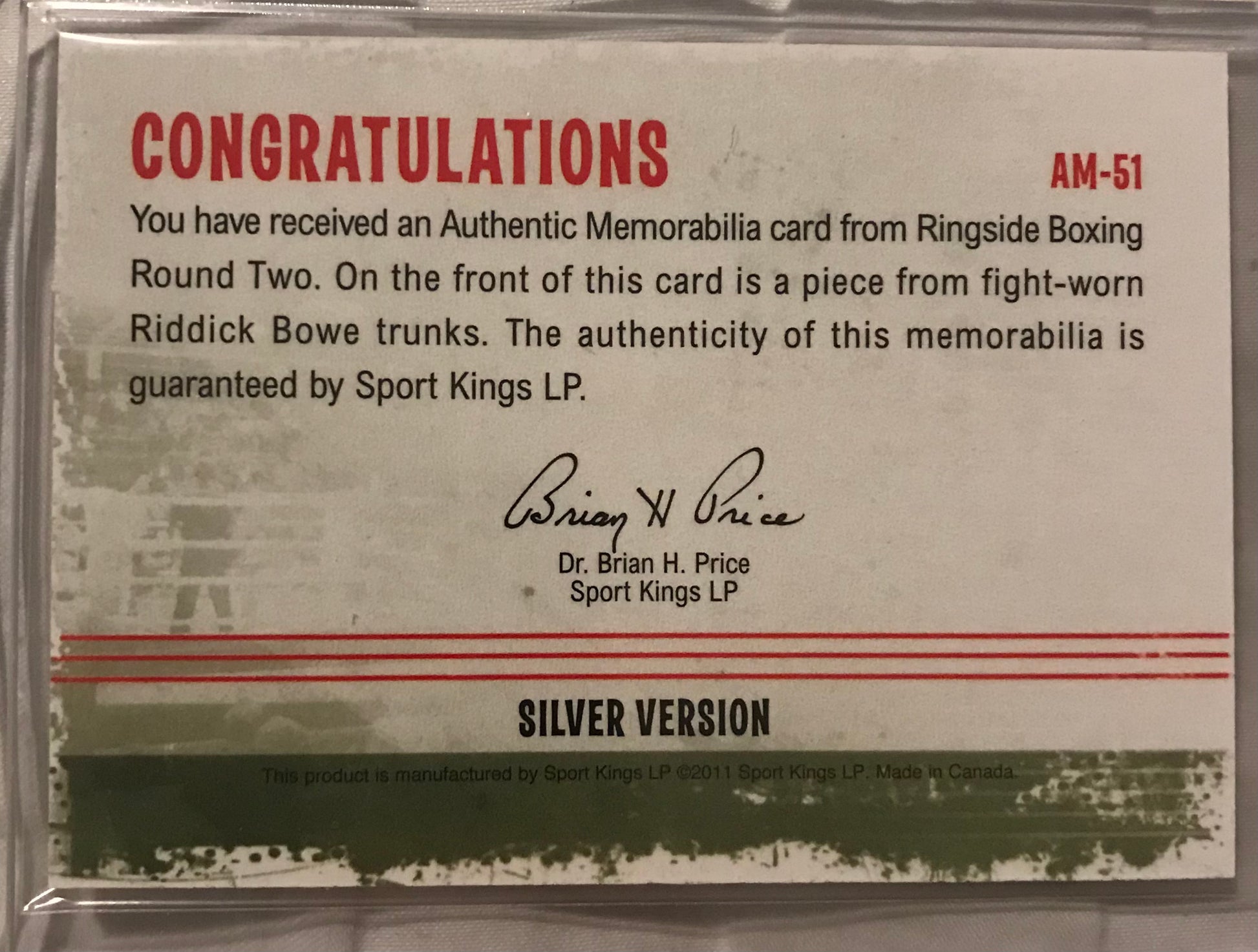 Ringside boxing round 2 Riddick Bowe trunks relic AM-51 /78
